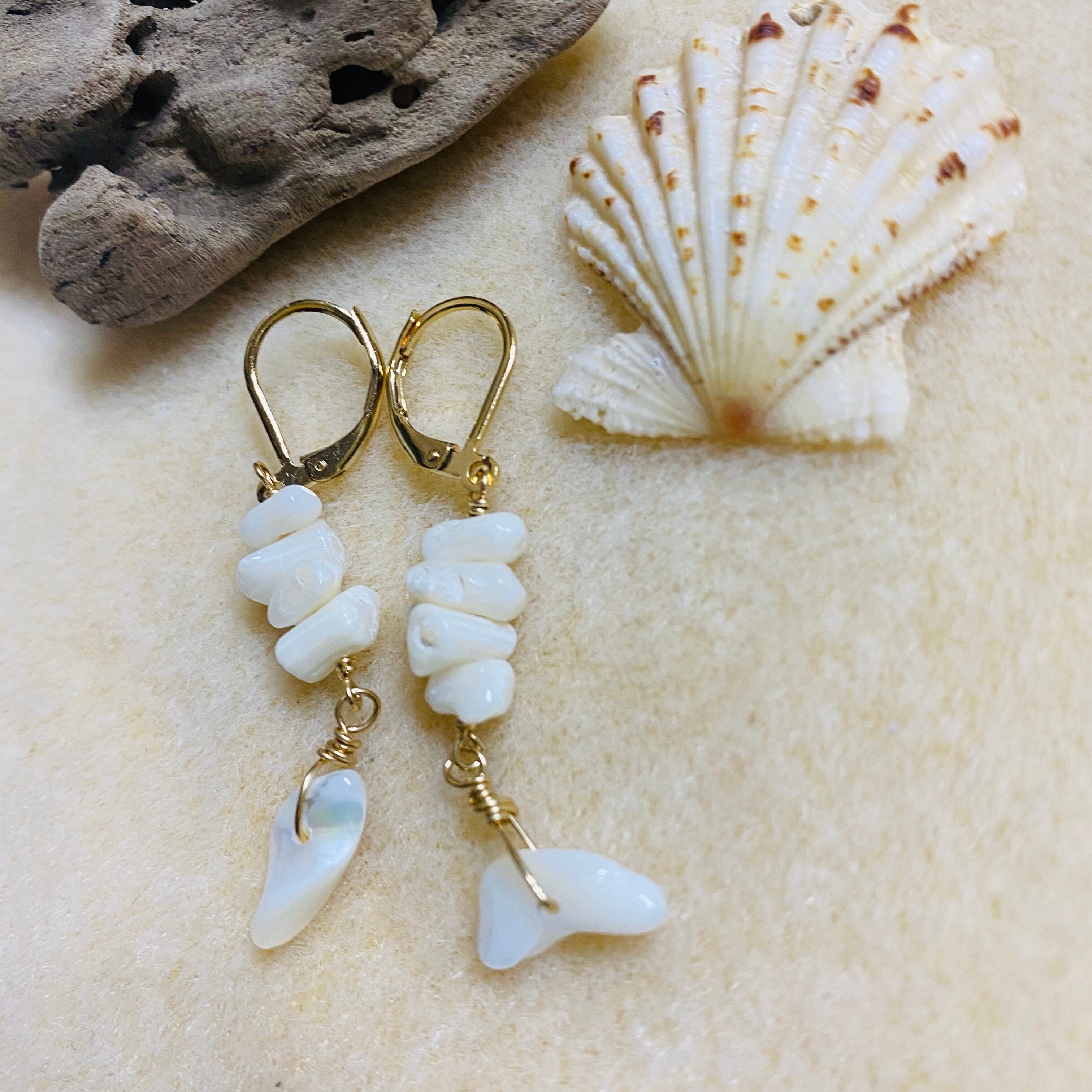 ホワイトはほんまに可愛い!!珊瑚とマザーオブパールのロング海でもピアス♫